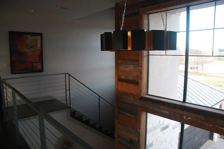 This modern lake house was softened with Reclaimed Brown & Gray Barn Boards on the entryway, kitchen island, bar front and the 2-story wrap custom staircase. This home was a part of the 2014 Parade of Homes in Kingsland, Texas.